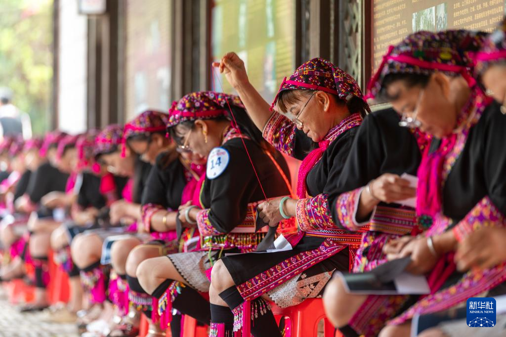 4月19日,海南省琼海市会山镇的苗族妇女在“三月三”活动上参加苗绣比赛。