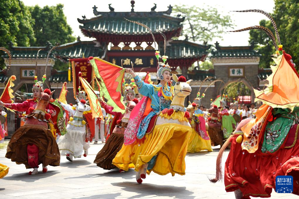 这是4月19日在广东佛山祖庙北帝诞春祭大典上拍摄的民俗表演“潮州布马舞”。