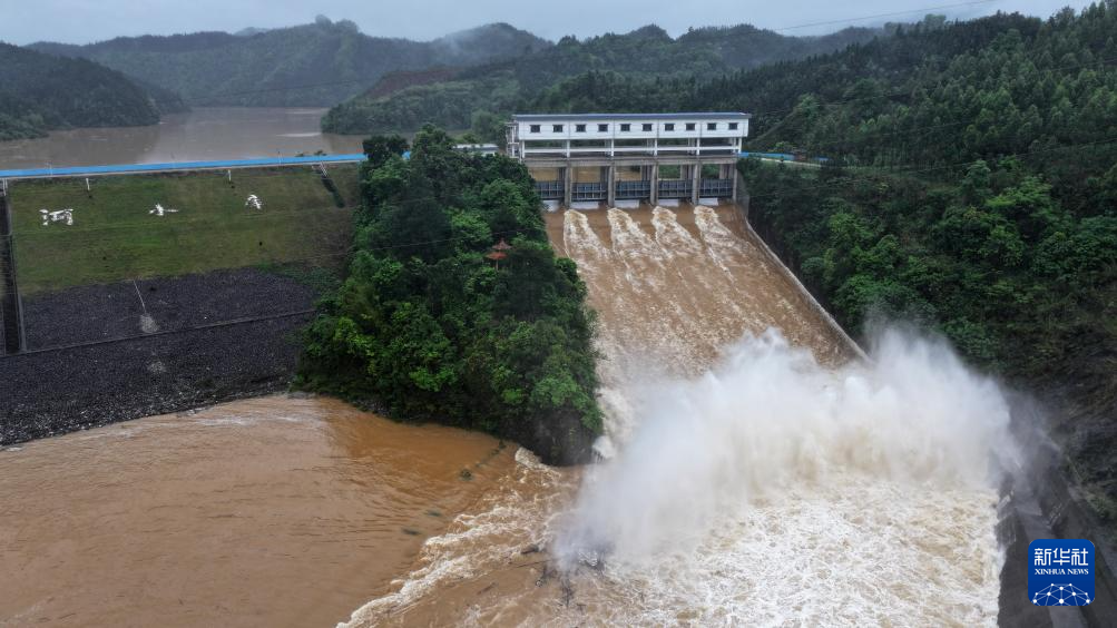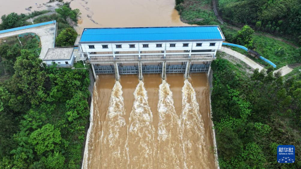 4月21日,广西柳州市融安县泗维河水库开闸泄洪(无人机照片)。